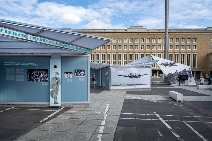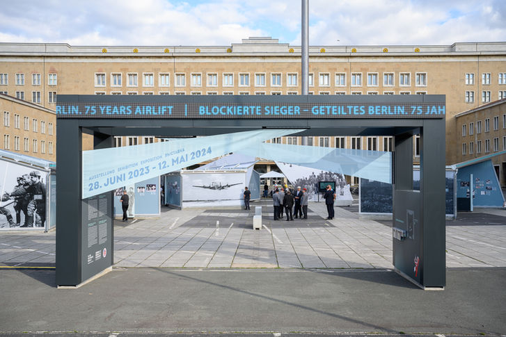 Zum 75 Jährigen Jubiläum der Luftbrücke in Berlin wurde eine Sonderausstellung auf dem Ehrenhof vor dem Tempelhofer Flughafen errichtet. Verteilt auf 3 freistehende, überdachte Pavillons werden Inhalte rund um das Thema Luftbrücke beleuchtet.