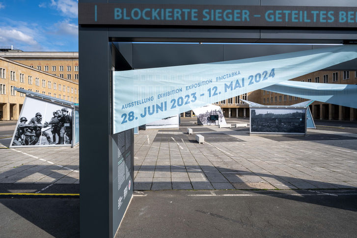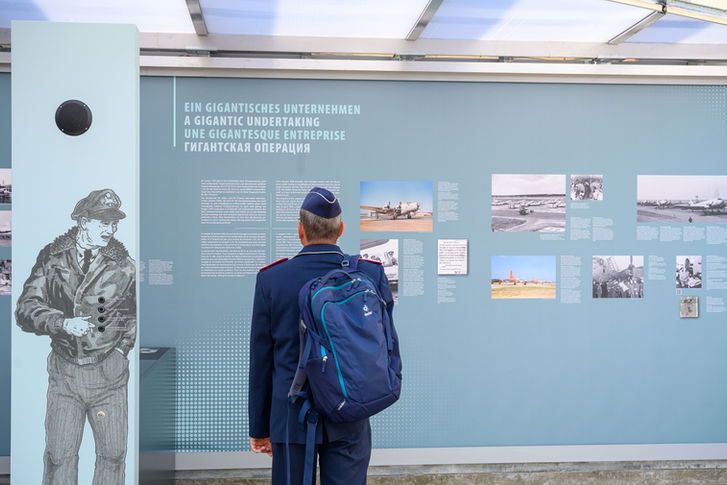Während die Farbe der Ausstellung assoziativ das Thema Luftbrücke aufgreift, erinnert die Form der Dächer an die Tragflächen eines Fliegers und lässt einen dynamischen Kontrast zur strengen Architektur im Hintergrund entstehen. Großgrafiken leiten dabei stimmungsvoll in die Themenbereiche ein und erreichen eine hohe Fernwirkung.