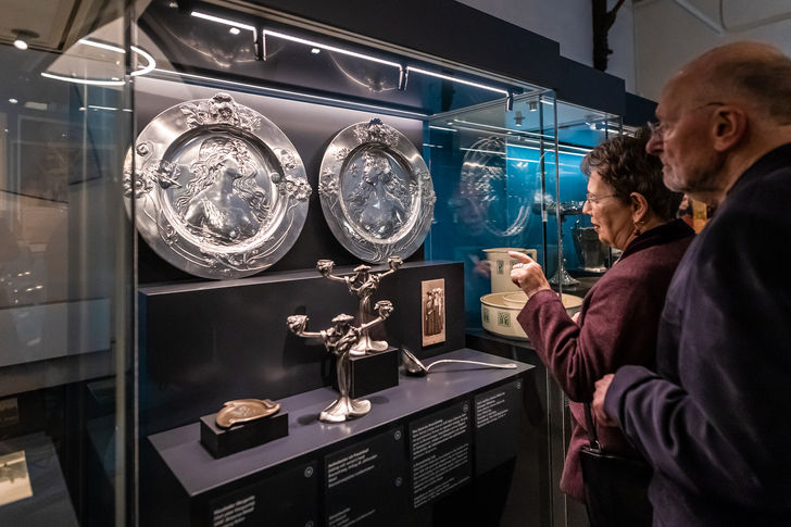 Auf zwei Geschossen des Klosters Hinter Ägidien entstand eine verknüpfende Ausstellungsarchitektur, welche durch unterschiedliche Farben die Themenbereiche akzentuiert und die Besucher*innen auf vielfältige Weise in die Welt des Jugendstils eintauchen lässt.